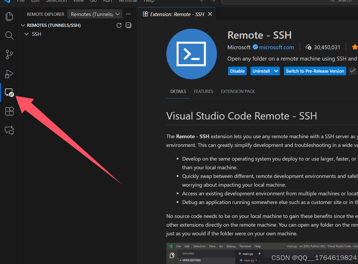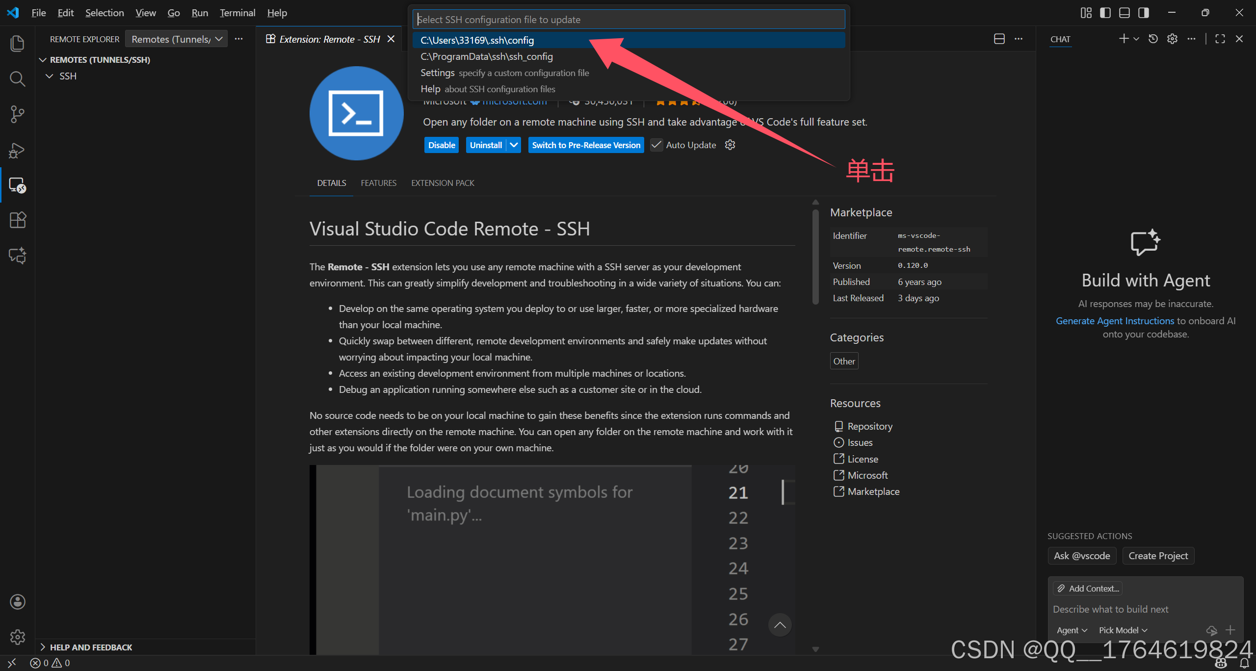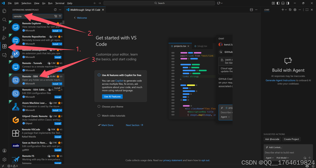 打开安装好的Vscode,然后选择扩展,输入:remote,选择Remote-SSH安装。