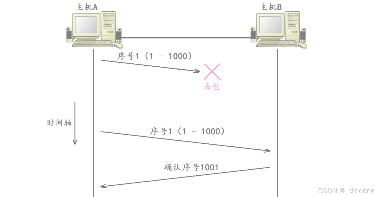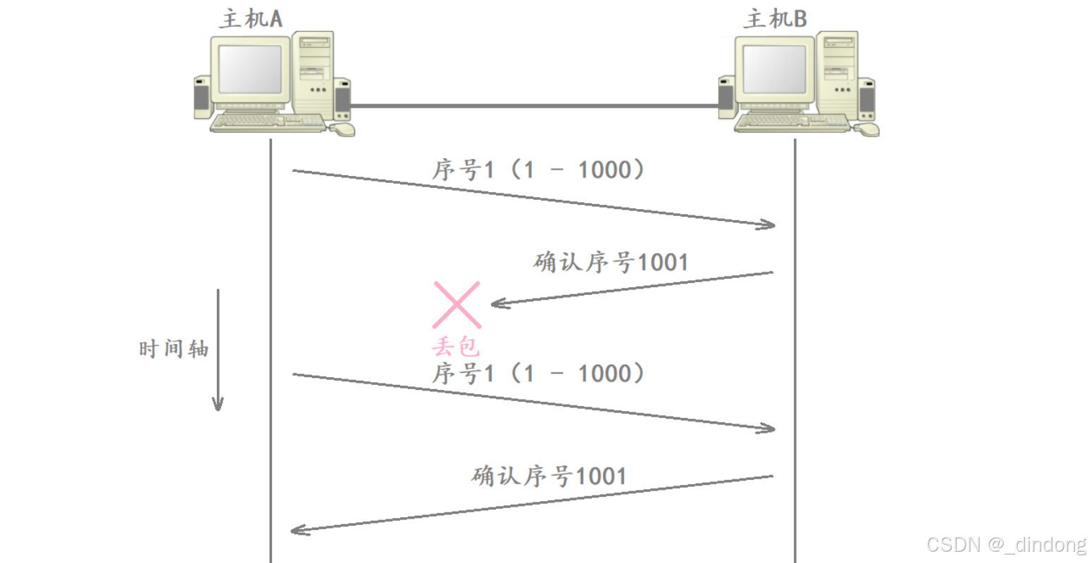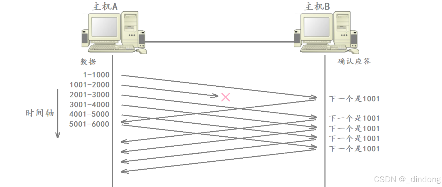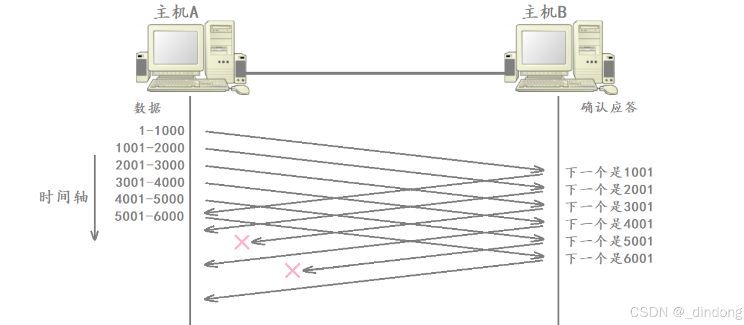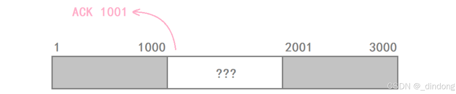 如果这三个报文在网络传输过程中出现了丢包,最终只有序号为1和2001的报文被主机B收到了,那么当主机B在对报文进行顺序重排的时候,就会发现只收到了1-1000和2001-3000的字节数据。此时主机B在对主机A进行响应时,其响应报头当中的32位确认序号填的就是1001,告诉主机A下次向我发送数据时应该从序列号为1001的字节数据开始进行发送。