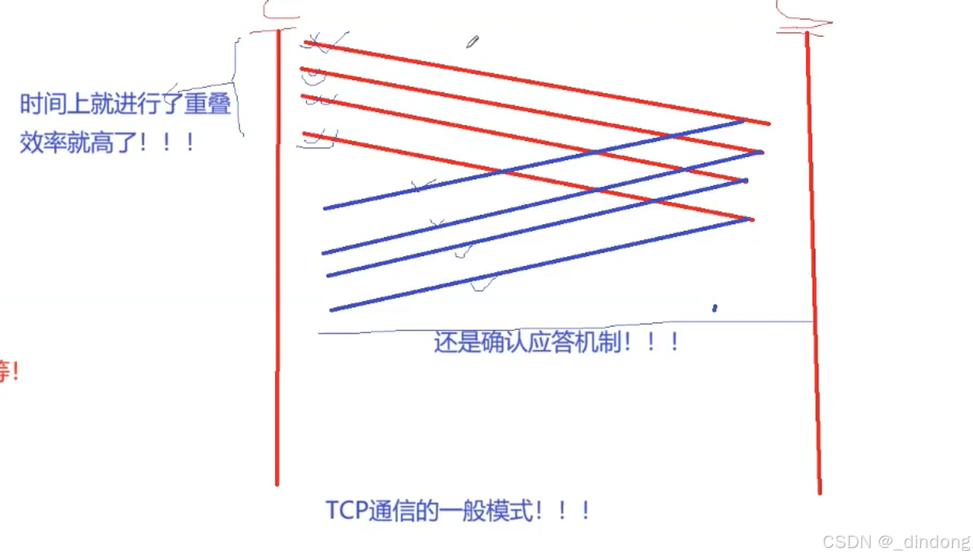 TCP的一般模式下,发送方一次可以发送多个请求,不需要发一个等应答再发下一个,从而提高效率,不过这依旧是确认应答机制。而且发送顺序和接收顺序不一定一致,这就导致数据传输的不可靠。解决方法就是给发送的消息带上序号,从而保证按序到达(可靠性)。