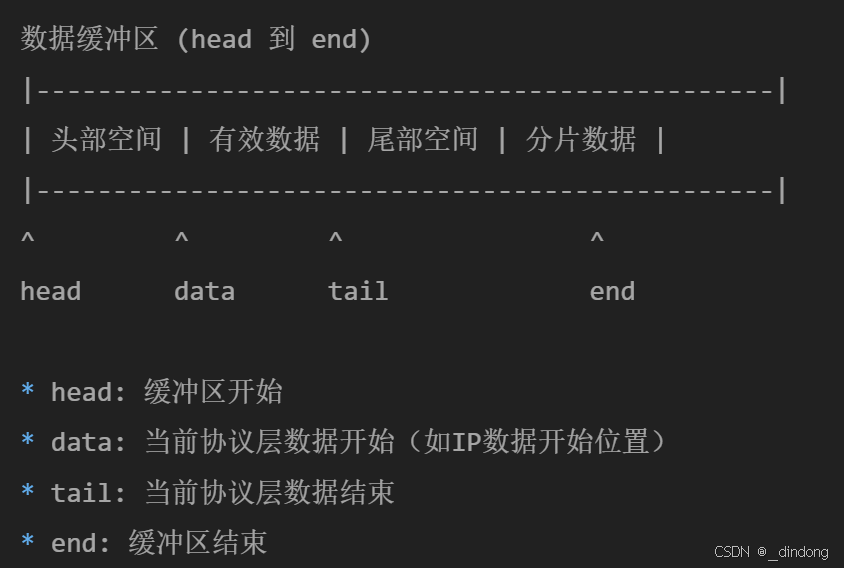 从上到下对应低地址(一段空间最开始的位置)到高地址,在data和head之间会预留部分空间,这部分空间用于封装报头以及解包。