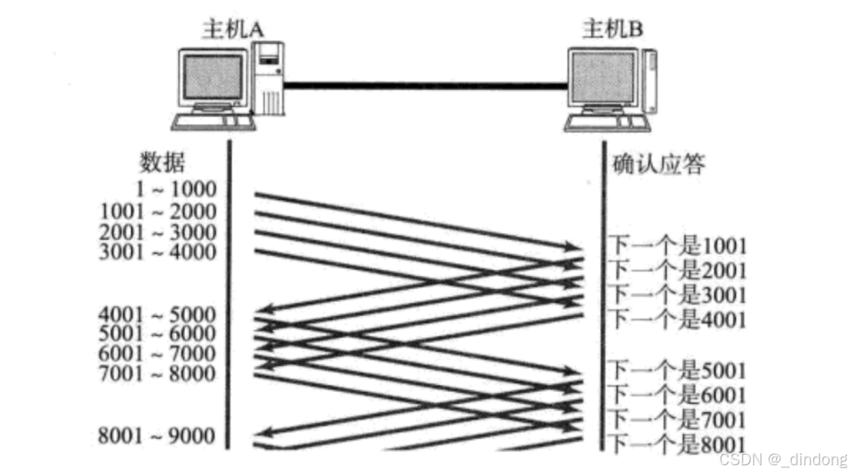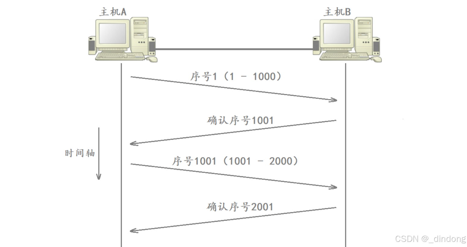还是以刚才的例子为例,主机A发送了三个报文给主机B,其中每个报文的有效载荷都是1000字节,这三个报文的32位序号分别是1、1001、2001。