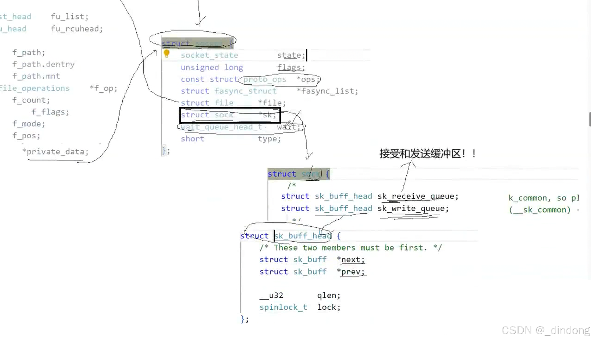 网络服务器本身是一个进程,是进程就有PCB(task_struct),有PCB就必须有文件描述符表,有文件描述符表就必定有文件对象file,file结构体内部的private_data指针指向socket对象。stock结构体中有回指向file的指针,以及一个wait_queue_head_t类型的等待队列(套接字读写条件不具备的时候,进程会在该队列中进行等待,比如调用recevfrom),以及一个struct sock类型的sk。sock内部具有sk_buff_head类型的接受和发送缓冲区,sk_buff_head内部的sk_buff类型的next和prev指针就和报文联系上了。