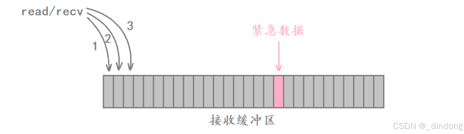 recv函数的第四个参数flags有一个叫做MSG_OOB的选项可供设置,其中OOB是带外数据(out-of-band)的简称,带外数据就是一些比较重要的数据,因此上层如果想读取紧急数据,就可以在使用recv函数进行读取,并设置MSG_OOB选项。这样读取就不再按序读取,而是直接读取紧急数据的最后一个字节(对于某些非常特定的场景,只读取一个字节是足够的。但对于绝大多数现代应用需求来说,这远远不够,而且极不可靠),如果后续还有内容,这个位置就会出现缺漏,破坏了TCP的流式特性。**但紧急数据本身在接收缓冲区中仍然是按序存放的。** 这个机制由于设计复杂且容易出错,在实践中基本已被抛弃。