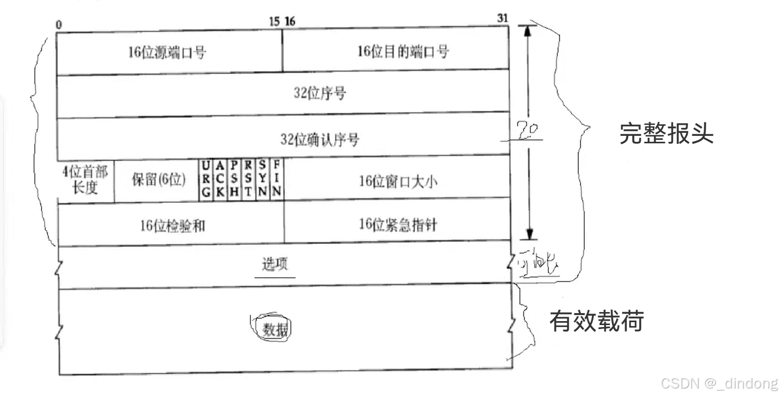 ——32位序号/32位确认序号:分别代表TCP报文当中每个字节数据的编号以及对对方的确认,是TCP保证可靠性的重要字段。
