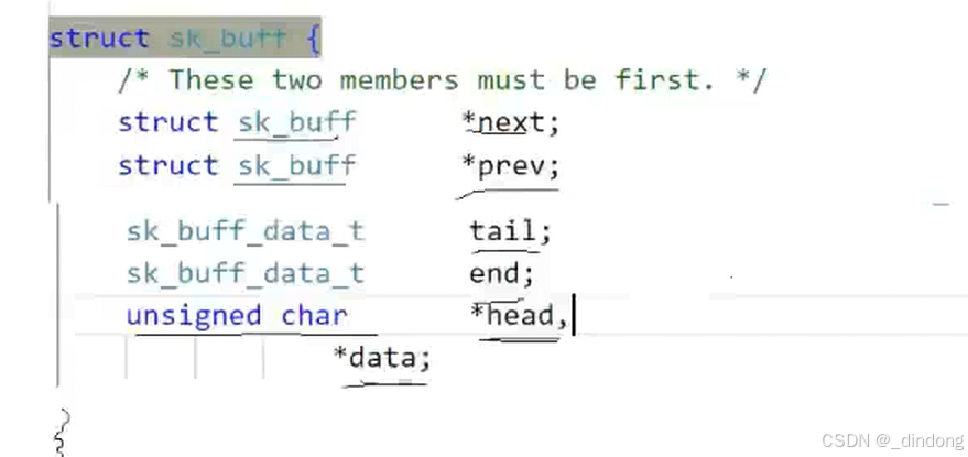 内核中一定存在描述报文的结构体,在linux中,描述报文的结构体是sk_buff(套接字缓冲区),不管是应用层封装报文 沿着网络协议栈 从上往下传递到下层的过程中,还是从底层网卡接收到链路层,内核都会创建一个sk_buff结构体对象。该结构体的关键字段如下: